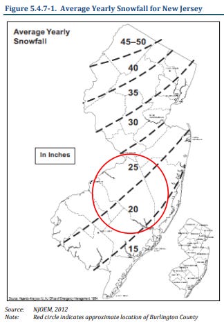 *See the Burlington County Public Safety Department’s 2019 Hazard Mitigation Plan which provides a winter weather hazards map. Mount Holly area gets about an annual average of 25 inches of snowfall. https://co.burlington.nj.us/462/All-Hazards-Mitigation-Plan
