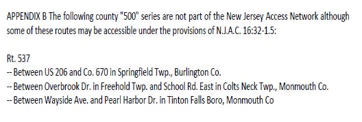 The Mount Holly reporter inquired with County Engineer Joe Brickley as to whether the structural characteristics of “500 and 600” series roads [such as Route 537] meant that townships had no choice but to accept heavy truck traffic. Mr. Brickley responded that the “structural issue is not the lone criteria.” In fact, a portion of Route 537 in Springfield township got exempted from the “New Jersey Access Network”. The NJ Access Network are roads designated by the State to carry heavy trucks.