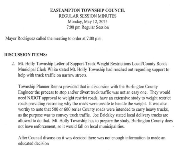 But it turns out that state law does not allow the ordinance to take effect unless neighboring municipalities support it by passing a Resolution of Approval. The rationale for this rule being if traffic must go around Mt. Holly’s streets, it may use other inappropriate streets in neighboring towns.