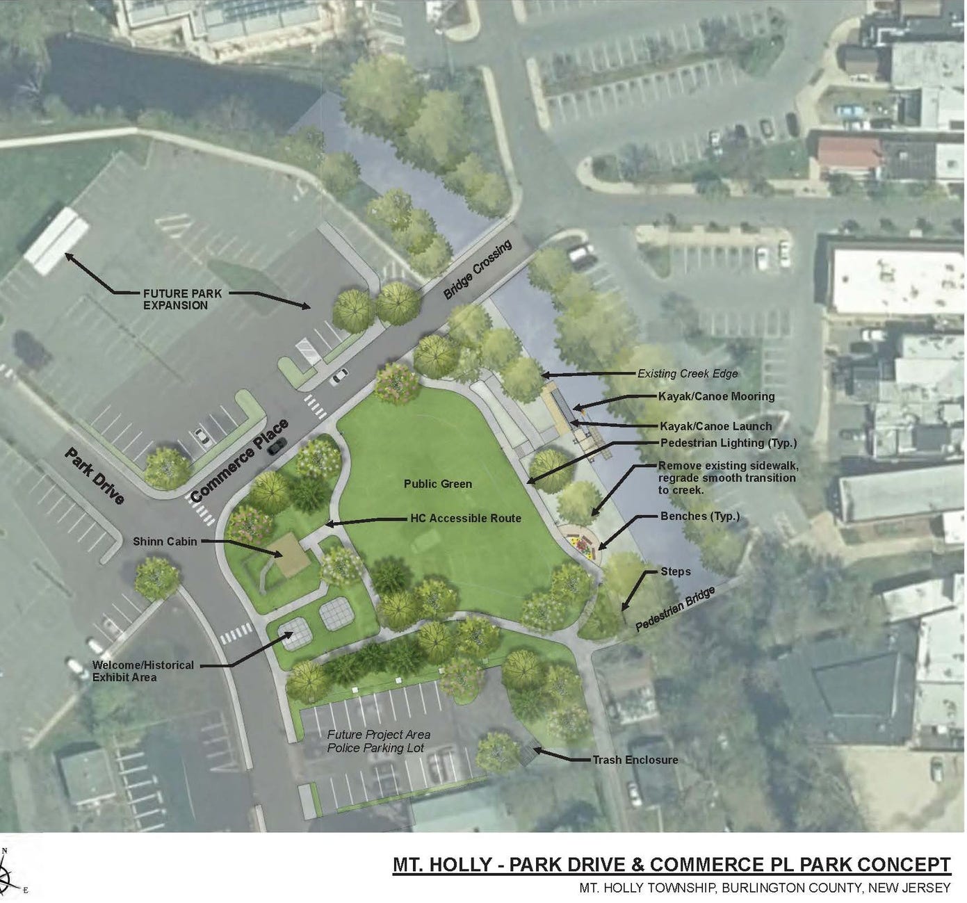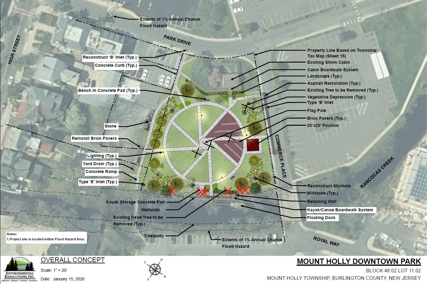The township is now communicating a new park design which appears to remove the “welcome/historic exhibit” and added pin-wheel of paving with a large flagpole at its center. If the image provided truly depicts a loss of the historic exhibit that would be a poor decision for “Historic Mount Holly”. Likewise the pinwheel of pavers and flag pole are duplicative of Veteran’s Park. The best part of the new design is a pavilion and adjacent paved area to host music and theatrical entertainment. See below.