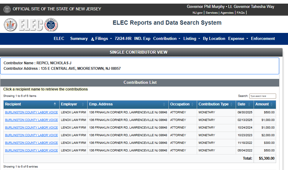 While Mr. Thiessen claimed he had no knowledge of Mr. Repici having given money to the Burlington County Labor Voice [BCLV], readers should recall that all the campaign mail and signs deployed for Thiessen were paid for by the BCLV. And records kept by the Election Law Enforcement Commission [ELEC] show repeated contributions by Repici amounting to at least $5,300. See image below.