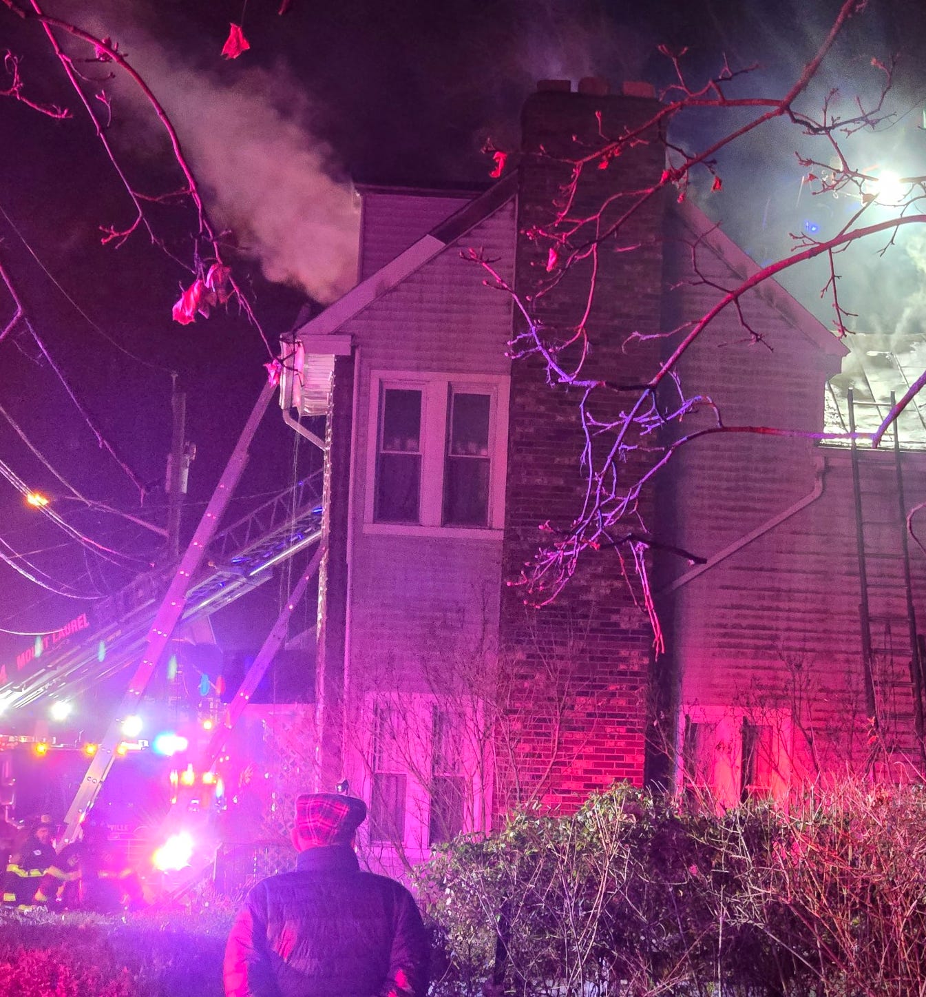 Two residents from the 100 block of Cherry Street are safe tonight along with their pets, but their home sustained heavy damage. Firefighters entered the house with self-contained breathing apparatus to sustain them through the thick smoke. There is a need for multiple teams of fresh fighters because air bottles limit the time that can be spent in a structure and because the heavy equipment incurs a high fatigue factor. One hazard observed at the scene that this reporter did not anticipate is the amount of flying debris that rained onto the street [and onto firefighters who were erecting ladders] as windows were smashed out from inside the building. Another were tripping hazards of telecom wires that nearly entangled a firefighter who climbed a hydraulic ladder projected from a truck. An official at the command center stated that the “RV Districts” and Mount Laurel run together on “structure fires”. The Reporter observed vehicles from Evesham, Mt. Holly, Mt. Laurel, Eastampton, Westampton, Lumberton, Florence, Willingboro, and Burlington at the scene. The fire appeared to be extinguished by 9 pm.