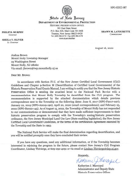 That letter cites years of inquiries to Township Manager Josh Brown which did not receive a reply. In the letter, the NJDEP states that since 2017, they have been trying to determine if Mount Holly has “…made sufficient improvements to their historic preservation program to comply with the Township’s zoning historic preservation ordinance…”. Since Mount Holly failed to respond to these inquiries, the NJDEP recommended that the National Park Service decertify Mount Holly from the Certified Local Government program. [CLG program]