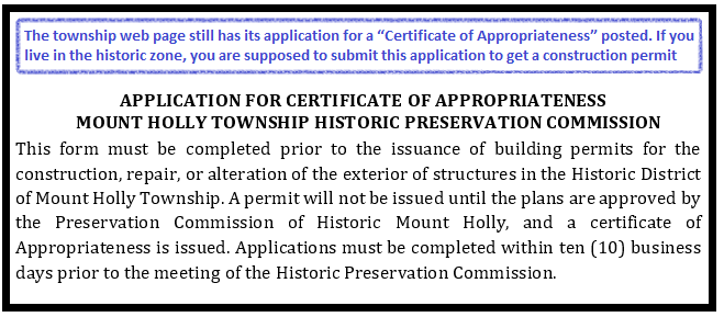 But that is not all. In a stunning acceleration to the loss-potential of Mount Holly’s historic heritage, our elected township officials are now moving to put new policies in place that will make it easier to conduct wholesale demolition of historic buildings.