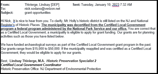 The NJDEP wrote back to The Reporter about the current status of Mount Holly’s CLG and whether that status causes a loss of grant opportunity. It does. See the email for yourself.
