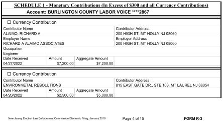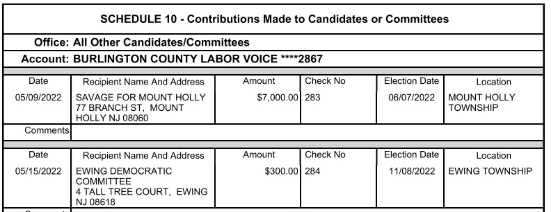 ELEC paperwork records that the Burlington County Labor Voice [BCLV] exists to “support candidates who value and support creation of local jobs” and to give to charity. In April of 2022, BCLV raised over $12,000 from two Mount Holly Township vendors. Then in May of 2022, just prior to the primary election, BCLV contributed $7,000 to the campaign of Kristin Savage, who was running for Town Council. This massive contribution is made in the context of a race where typical contribution are $50 or $100.