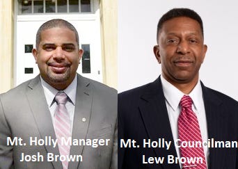 Council member Lew Brown, who was first elected in 2012, is seeking a fourth term on Mount Holly Town Council. His son Josh Brown has served as Township Manager since 2017. A 2017 article by the Burlington County Times stated that Mount Holly “officials said the municipality does not have an anti-nepotism ordinance” but its code of ethics forbids employees from using their position “to secure unwarranted privileges or advantages."