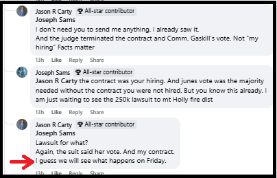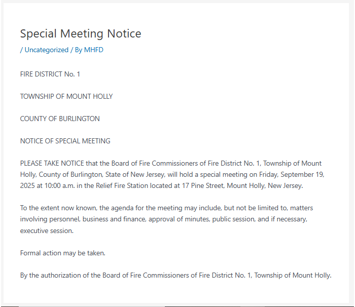 A clue as to the special reason for the unusually timed special meeting may have been dropped on Facebook by the former Director of Mount Holly Fire District, Jason Carty. He speculated that the position from which he was ejected by Judge Cook might be on the agenda.
