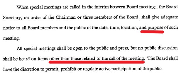 Regarding the purpose of the meeting, it should be noted that the Bylaws indicate a Special Meeting should have a limited purpose that is revealed to Members and the public. It is specifically stated in the Bylaws that the public will only be allowed to address the topic for which the meeting was called. Which suggests that the Board would know what the topic is an inform the public of same.