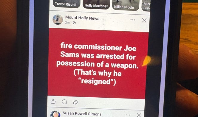 Joe Sams served Mount Holly as a firefighter for 25 years and also as a Fire Commissioner. Last night he spoke about a post on ‘MOUNT HOLLY NEWS” which is a Facebook page with unclear origins. Sams claimed the post was written by suspended Fire Director Jason Carty, who is currently being investigated for personnel issues.