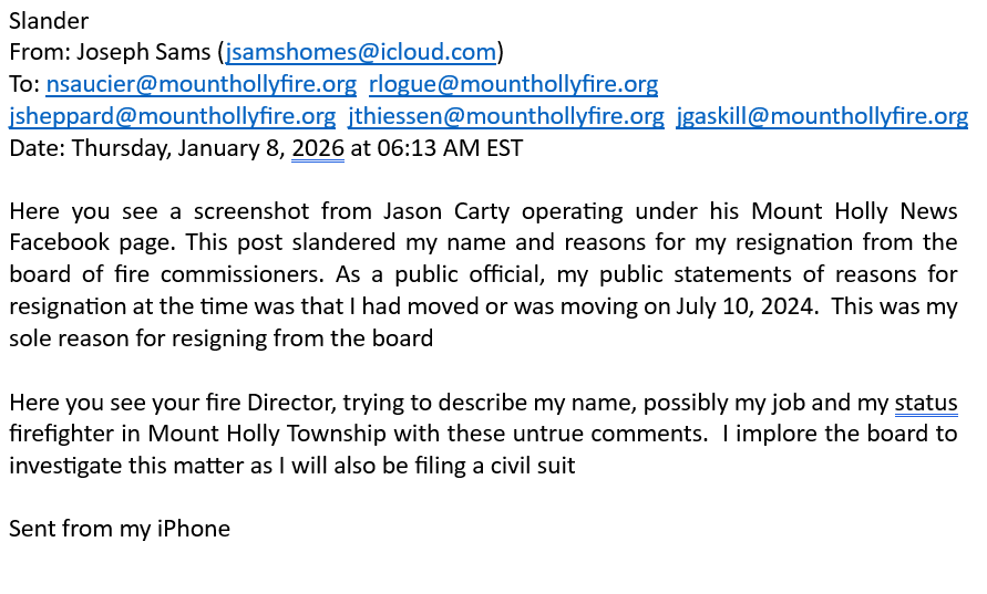 With regard to whether Mr. Carty is the writer behind “Mount Holly News”, I was the subject of a recent Mount Holly News post which stated “Fake reporter Nick Sodano passing out fear-mongering flyers”. The post features a ring camera at someone’s home showing me delivering a flyer about the Fire District meeting. Jason Carty texted me prior to this post indicating that he objected to me delivering the flyers.