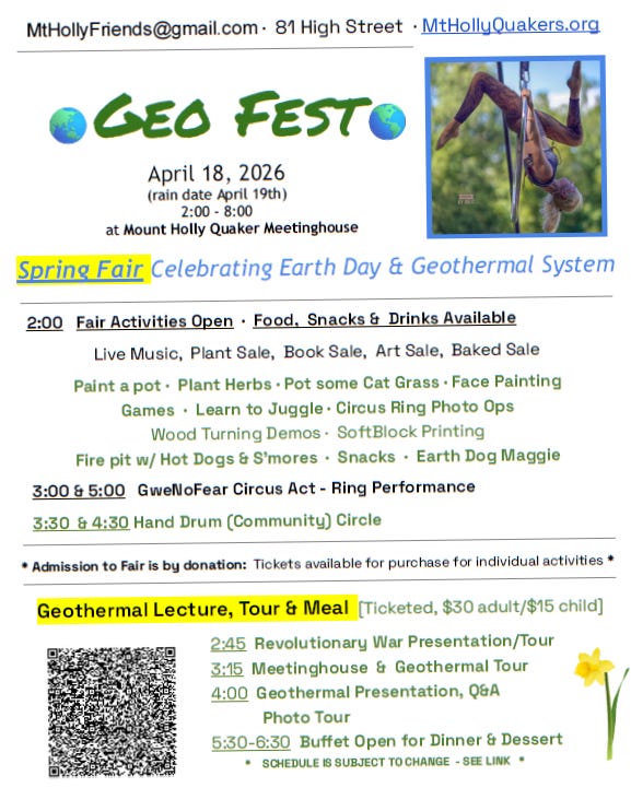 To be clear, the Quakers [81 High Street] are hoping to raise money from participants to finance their geothermal heating/cooling system. So, if you can swing a donation it would be appreciated. But all are invited regardless of whether you donate to enjoy the festivities: crafts, snacks, presentations and music from 2 - 8 pm on Saturday, April 18th. See the flyer below