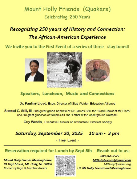 MT HOLLY FRIENDS 250TH ANNIVERSARY CELEBRATION: SPEAKERS, LUNCHEON & MUSIC