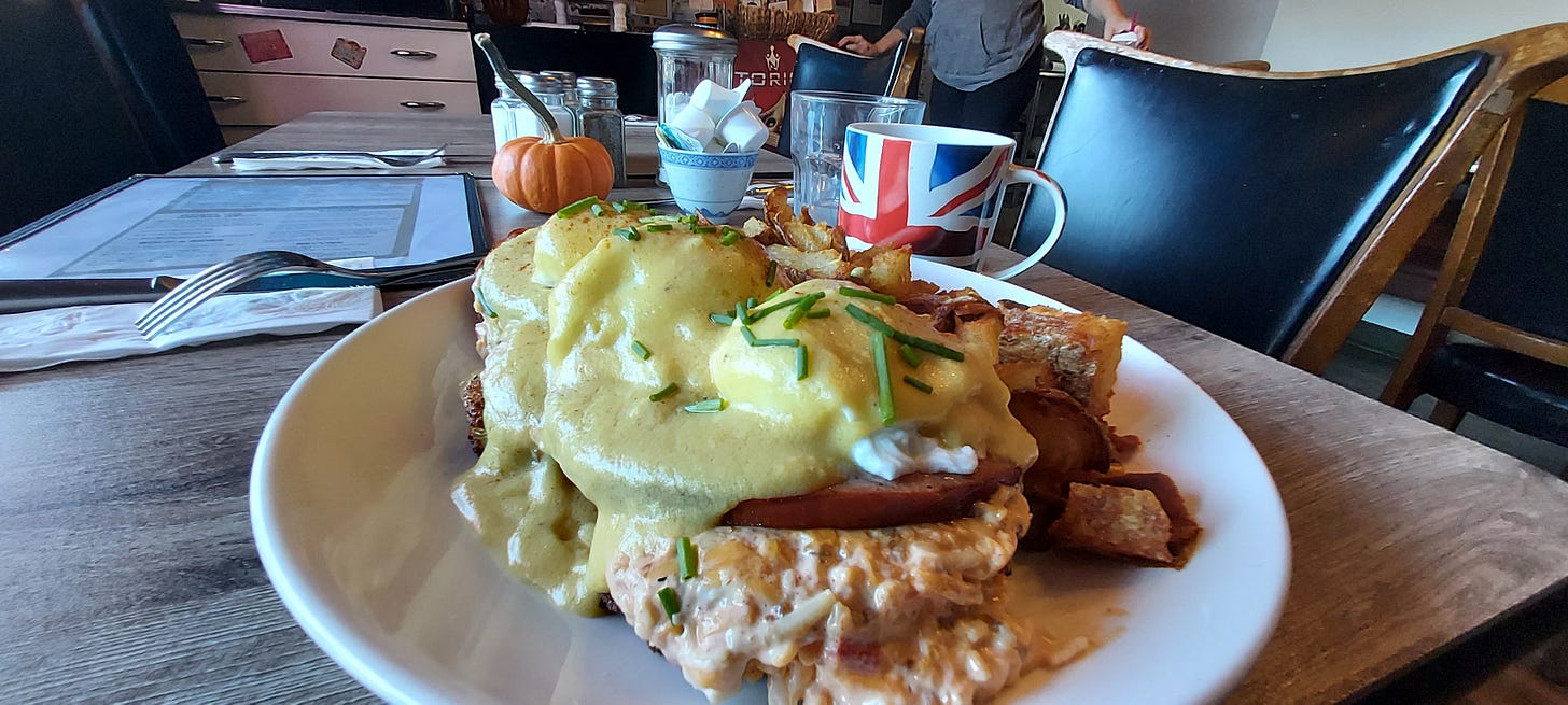 My lunch was the “Fried Green Tomato Bennie” which featured “hand carved ham, perfectly poached eggs on a bed of signature pimento cheese and crispy fried green tomatoes topped with house made Hollandaise.” The plate had a seriously ample portion that was so good that I found myself nibbling on what amounted to a second serving. “Desi” called the side on my plate “crispy potatoes”, but honestly, somehow I have never seen fried potatoes like these. Really good.