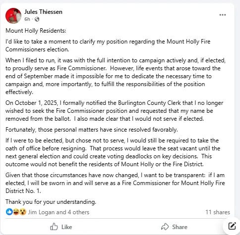 At 10:32 AM on October 31, 2025, The Mount Holly Reporter notified Jules Thiessen via text that we would publish an article stating that he failed to respond to repeated questions about whether he changed his mind about withdrawing from the race and not serving.