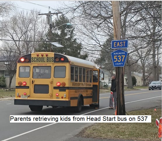 The NJDOT “Safe Routes to School” Program partners with schools and communities to create safe conditions for all pedestrians. Staff there told me that they could not dictate the route that Head Start buses should take, but clearly Route 537 was not a good choice. They advised me to take my safety issue to the Administrator of the Head Start program.