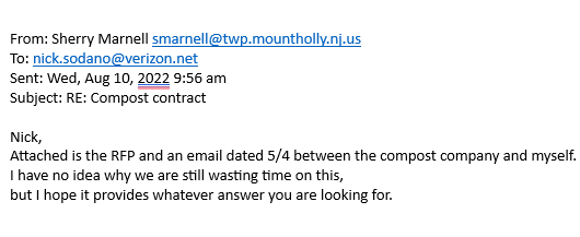 I wrote to the Mayor recommending that the Twp enforce this contract provision on the vendor and cease asking Public Works to transport compost to the park. Additionally, since the vast majority of residents do not know we offer free compost, I recommended that we get the word out on the webpage and perhaps in a MUA bill.
