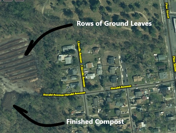 Eventually, Public Works gave me the lock combination and permission to enter the composting facility at the end of Herald Avenue. When I visited I was impressed by the size of the operation and its numerous, giant rows of ground leaves. The image below with the adjacent homes gives you a sense of its size.