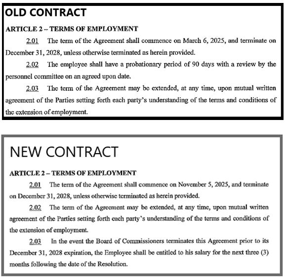 Recall that Carty’s first contract [March 2025] and employment and were nullified by Superior Court Judge Cook in September due to Commissioner June Gaskill’s illegal conflict of interest vote for Carty. But by November 25, 2025, a new contract was in place which gave Carty significant enhancements compared to his old contract.